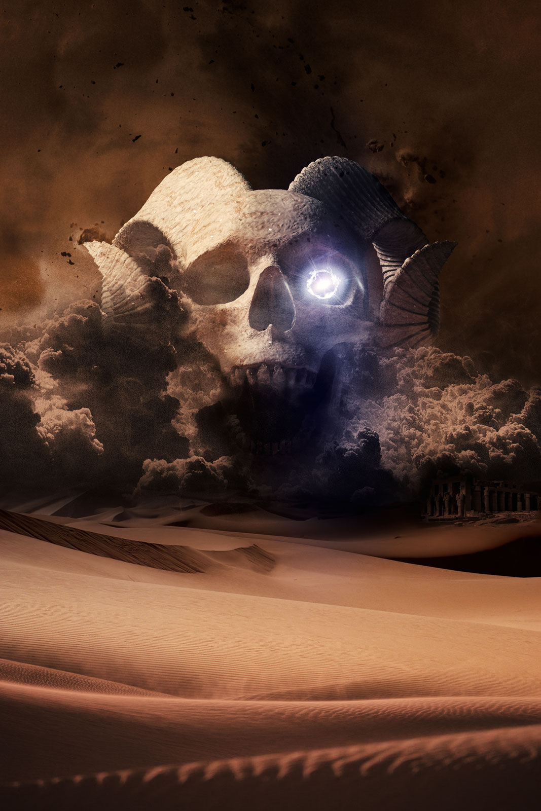 - Un teschio con le corna ricurve incombe sullo sfondo. Che sia Anubi? No no, questo è ancora più brutto! per questo i due personaggi scappano 🙂